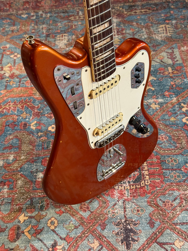 1967 Fender Jaguar in Candy Apple Red that has evenly faded to a gorgeous metallic orange.